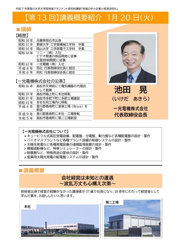 香川大学大学院地域マネジメント研究科公開講座「地域の中小企業と経済活性化」にて、当社の池田会長が講演することになり、今回その資料が送られてきました。